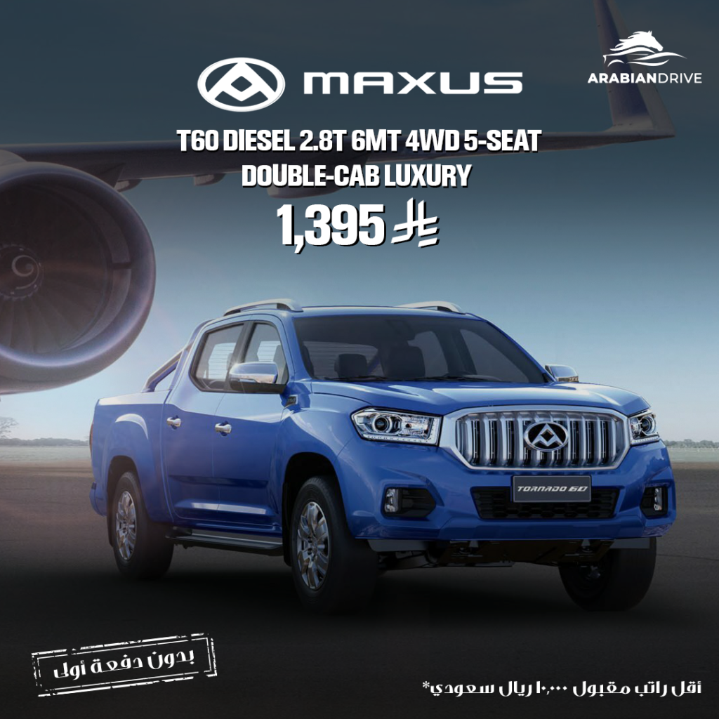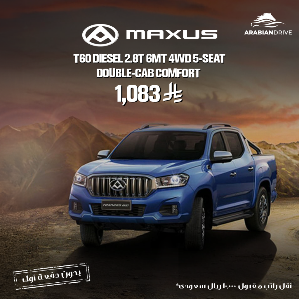 maxus T60 Diesel 2.8T 6MT 4WD 5-Seat Double-Cab Comfortماكسيوس T60 هي شاحنة بيك آب متوسطة الحجم تم تصنيعها بواسطة SAIC Motor تحت العلامة التجارية Maxus منذ نوفمبر 2016. إنها أول شاحنة بيك آب من SAIC تم بناؤها للسوق العالمية وهي أول شاحنة بيك آب صينية الصنع تسجل 5 نجوم في تصنيف ANCAP للسلامة.في أبريل 2019 ، تم الكشف عن خليفتها ، Maxus T70 ، في 2019 Auto Shanghai. لم تكن السيارة أول بيك آب تنتجها الشركة ، حيث أنتجت SAIC Motor سابقا شاحنات بيك أب تعتمد على شنغهاي SH760 ، ولكن مع اختلاف أكثر من 20 عاما في الإنتاج ، فإن شاحنات SH760 ليست سلف حقيقي لشاحنات T60.تعتبر ماكسيوس T60 هي نفس ام جي T60 لكن بشارة ماكسيوس ولمسات تصميمية خاصة. تأتي السيارة مع دفع ثنائي أو رباعي، مع محرك بنزين أو ديزل لتتوفر في 4 فئات.