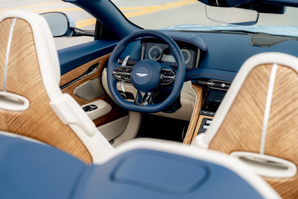 يظهر الإصدار الحصري بلون Frosted Glass Blue، الذي يدمج رقائق زجاجية متلألئة داخل طبقات الطلاء لخلق تأثير بصري يعكس بريق شمس جنوب فلوريدا على سطح المحيط. ويتم طلاء هذا اللون يدويًا بدقة فائقة، ولا يتوافر سوى من خلال Q by Aston Martin. تكتمل الإطلالة الرياضية والأنيقة بخطوط بيضاء رفيعة بلون Club Sport White، وعجلات ديناميكية بخمسة أضلاع بتقنية القطع الماسي بلون Gloss Jet Black.