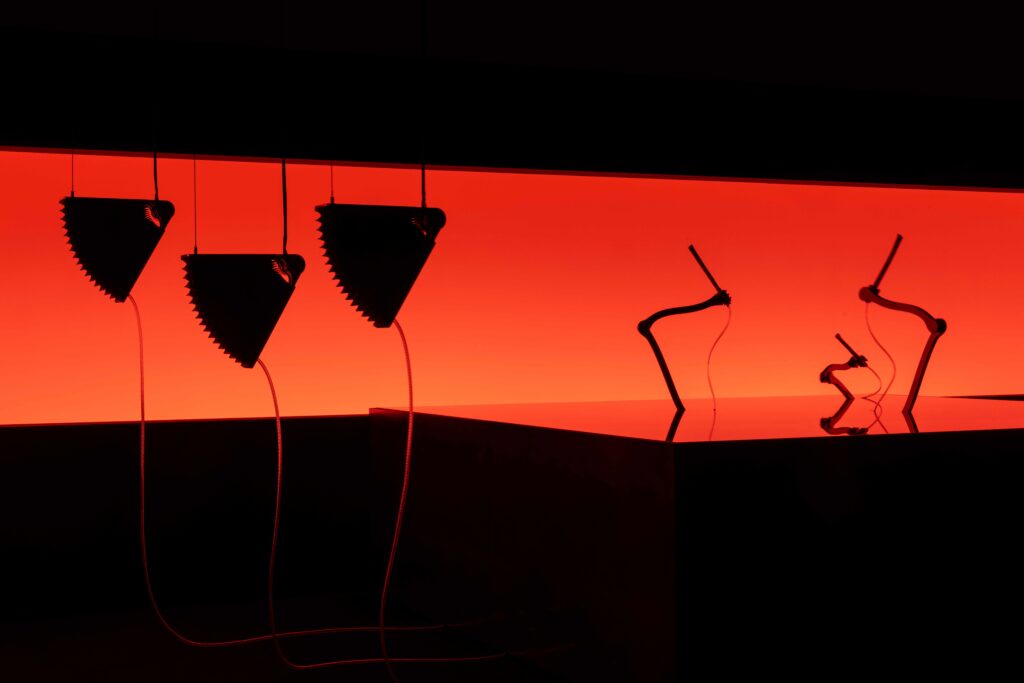 في عمله الثاني، قدّم A.A موراكامي تجربة تجمع بين التكنولوجيا المتقدمة والرموز البدائية. في “الكهف”، تخرج أذرع آلية من بركة مياه لتحرك آلات قديمة صنعت من نسخ عظام حيوانية، وتنتج سيمفونية من الأصوات والأضواء الحمراء التي تُحفّز الحواس وتثير التساؤلات حول معنى الإبداع في عالم متغيّر.
