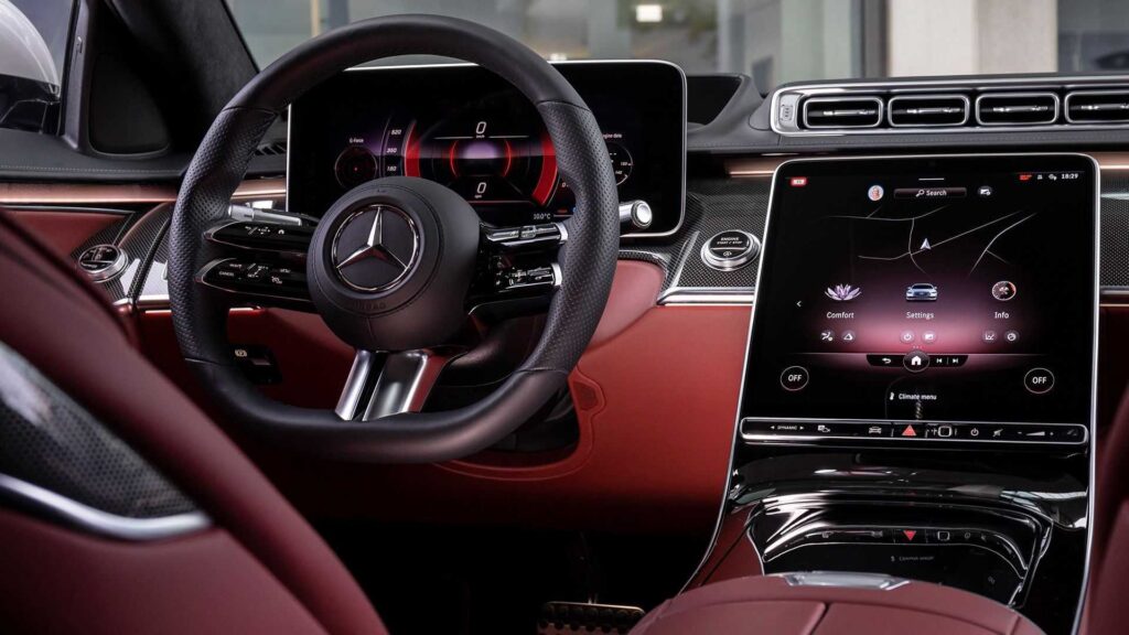 وبالدخول إلى المقصورة الداخلية، سوف تجد أن مرسيدس اهتمت بشكل كبير على التصميم واستخدام أفضل وأجود الخامات في جميع مناطق السيارة من الداخل، بداية من الجلود الطبيعية الفاخرة، بالإضافة إلى الأخشاب التي تتواجد من نفس الشجرة لضمان جودة وملمس واحد لجميع أجزاء الخشب التي تتواجد داخل المقصورة، كما تتوفر السيارة بمقود من الجلد متعدد الوظائف وبه حساسات أيضاً، كما توجد شاشة للعدادات بقياس 12 بوصة بجانب الشاشة الوسطية التي تعمل باللمس قياس 14 بوصة تقريباً والتي يوجد بها بصمة، مع إمكانية التحكم في العديد من الوظائف من خلال الشاشة.