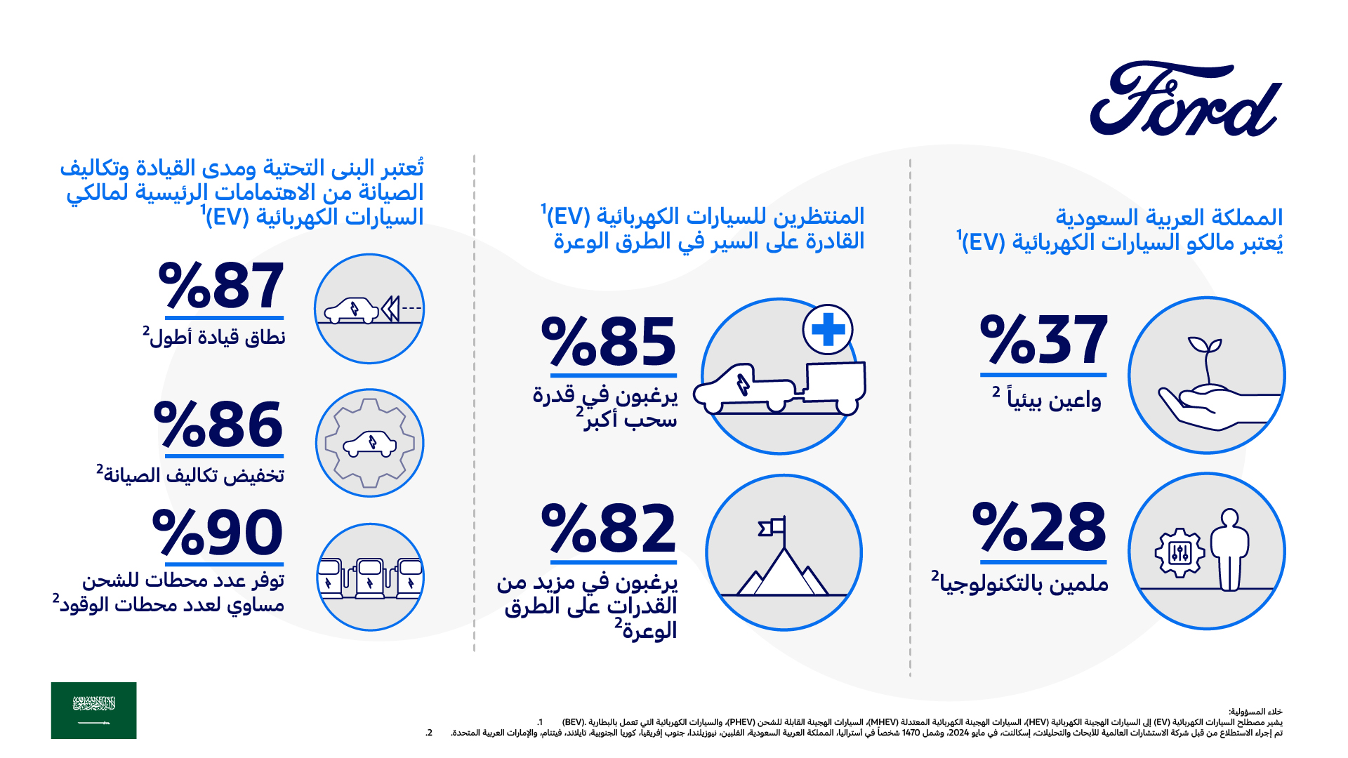 كجزء من أبحاثها في عدة أسواق، أجرت فورد دراسة على المقيمين في المملكة العربية السعودية ممن يملكون مركبة أو يبحثون عن شراء واحدة جديدة، وذلك لفهم آرائهم اتجاه المركبات الكهربائية، مما يساعد فورد في الاستعداد بشكل أفضل لتحقيق مستقبل كهربائي مستدام. تأتي هذه الخطوة كجزء من التزام فورد بدعم مستقبل المنطقة في مجال المركبات الكهربائية، بما يتماشى مع رؤية المملكة 2030.