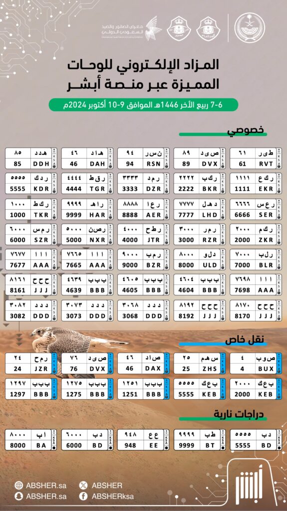 وكشفت منصة أبشر عبر حسابها على منصة إكس، عن اللوحات المميزة الجديدة المطروحة بالمزاد الإلكتروني، وتضمن لوحات خصوصي، ولوحات نقل خاص، ولوحات دراجات نارية.