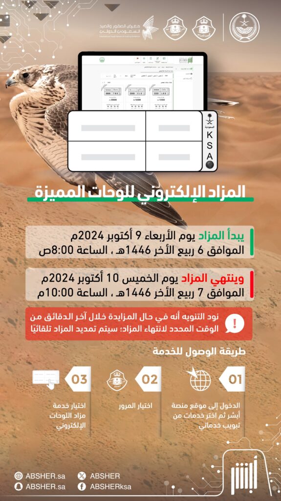 “أبشر” تكشف اللوحات المميزة الجديدة المطروحة في المزاد الإلكتروني