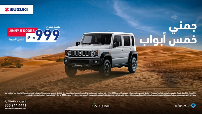 ارابيان درايف – السائق العربي – تمتع بأفضل عروض السيارات من شركة نجيب أوتو وكيل سوزوكي في المملكة، أعلنت الشركة عن إطلاق عرض جديد على تقسيط سيارات سوزوكي موديلات 2024 و 2025 في السعودية، بالتعاون مع البنك الأهلي السعودي خلال شهر أكتوبر.