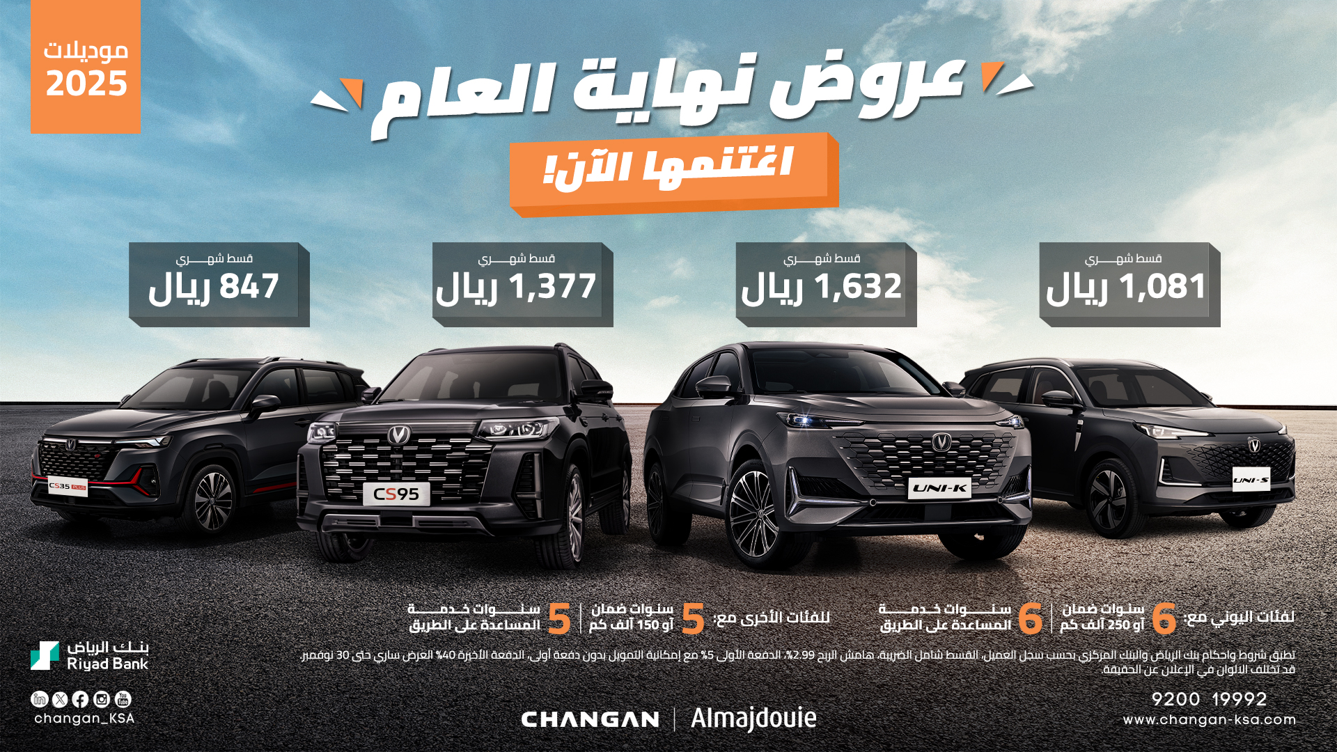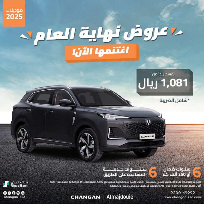ارابيان درايف – السائق العربي – تمتع بأفضل العروض من شركة المجدوعي للسيارات وكيل سيارات شانجان في المملكة العربية السعودية، أطلقت الشركة أحدث عروضها المميزة بمناسبة نهاية العام على تقسيط سيارات شانجان 2025، بأقل قسط شهري بالتعاون مع بنك الرياض.