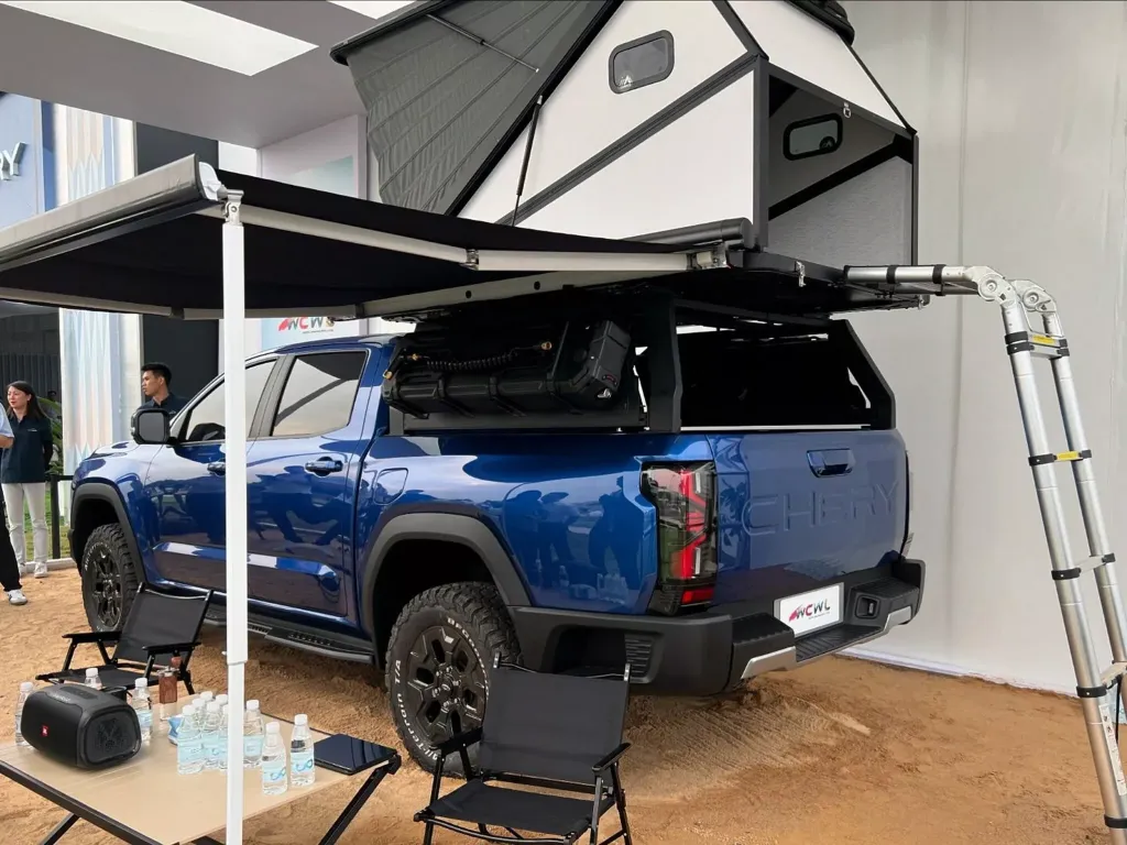 كما نرى إطارات جاهزة لجميع أنواع التضاريس، مع خلوص أرضي مرتفع، وعتبات جانبية على المصد الخلفي، كما نرى مصابيح خلفية LED وحروف CHERY كبيرة مرة أخرى في الباب الخلفي، وأضافت شيري اكسسوارات مخصصة للتخييم بما يشمل خيمة فوق السقف.