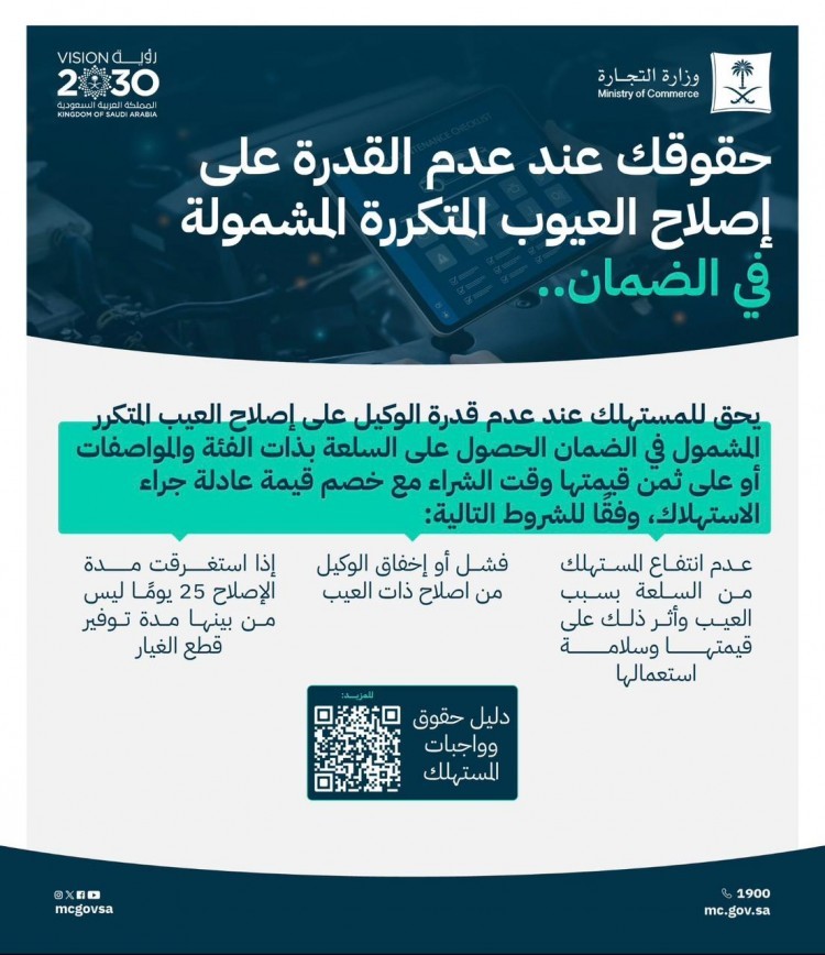ارابيان درايف – السائق العربي – كشف الحساب الرسمي لوزارة التجارة، عن حقوق المستهلك عند عدم القدرة على إصلاح العيوب المتكررة المشمولة في الضمان.