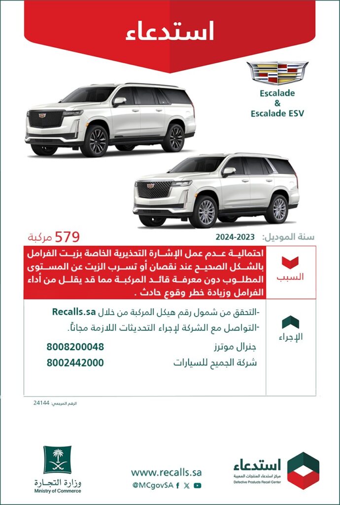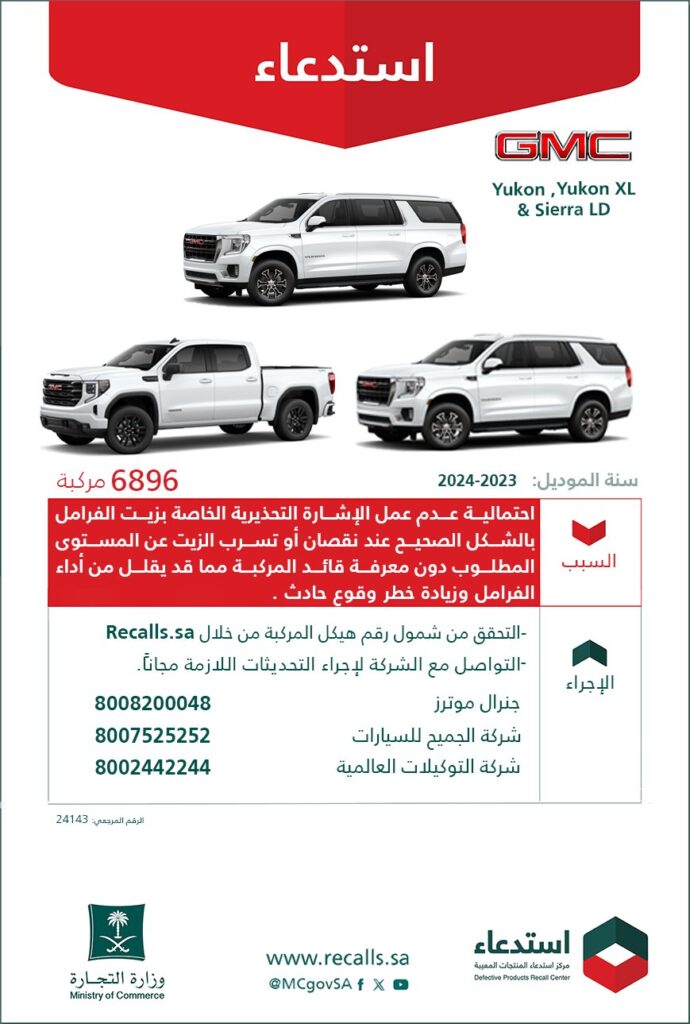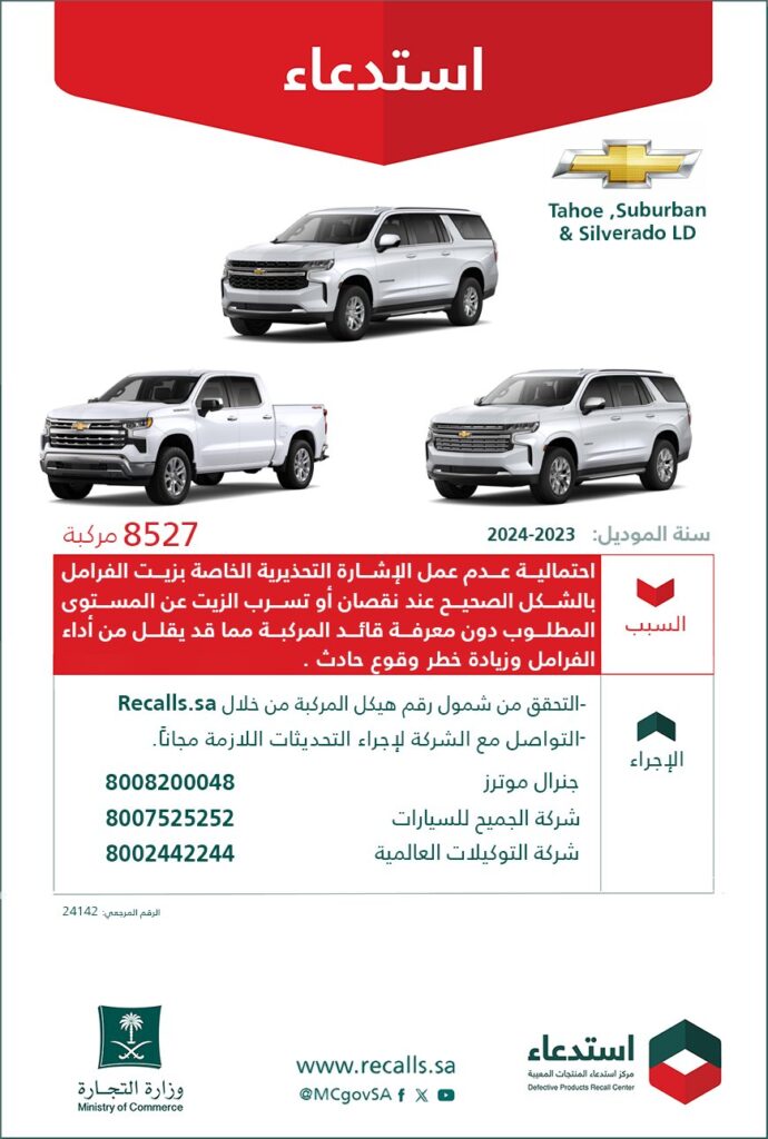 ارابيان درايف – السائق العربي – أعلنت وزارة التجارة، اليوم الخميس، عن استدعاء 16,002 مركبة شيفروليه “Tahoe / Suburban / Silverado LD”، وجي ام سي ” Yukon / Yukon XL / Sierra LD “، وكاديلاك “Escalade / Escalade ESV”، موديلات ” 2023 – 2024 “.