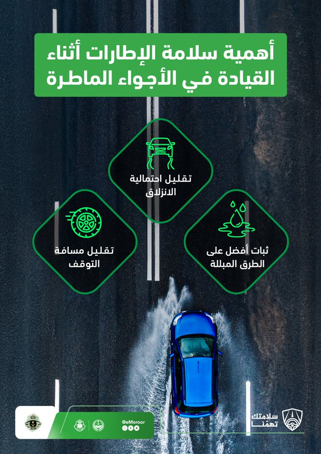 ووضحت الإدارة من خلال إنفوجرافيك نشرته عبر حسابها على منصة (إكس)، مدى أهمية الإطارات أثناء القيادة في الأجواء الماطرة، مشيرةً إلى أنها تؤدي لتقليل احتمالية الانزلاق، وكذلك تساعد على الثبات بشكل أفضل على الطرق المبللة، بالإضافة إلى أنها تعمل على تقليل مسافة التوقف.