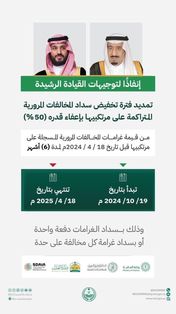 إنفاذًا لتوجيهات القيادة .. تمديد فترة تخفيض سداد غرامات المخالفات المرورية 6 أشهر
