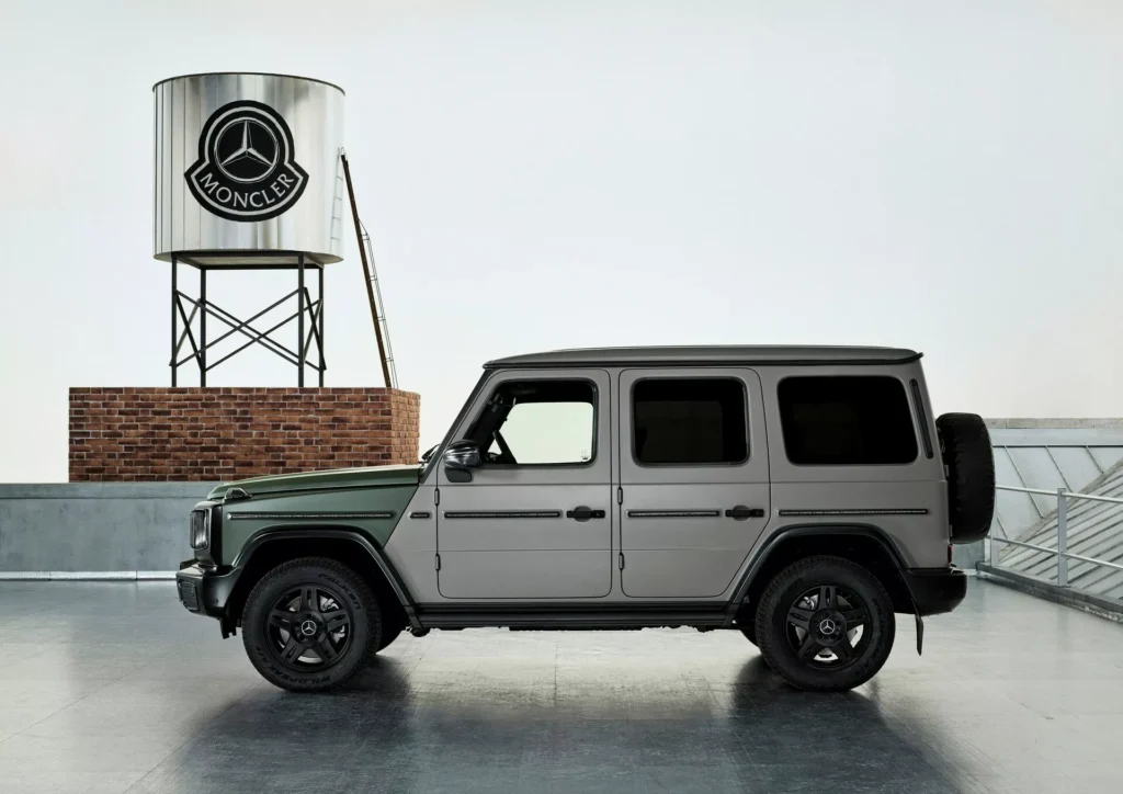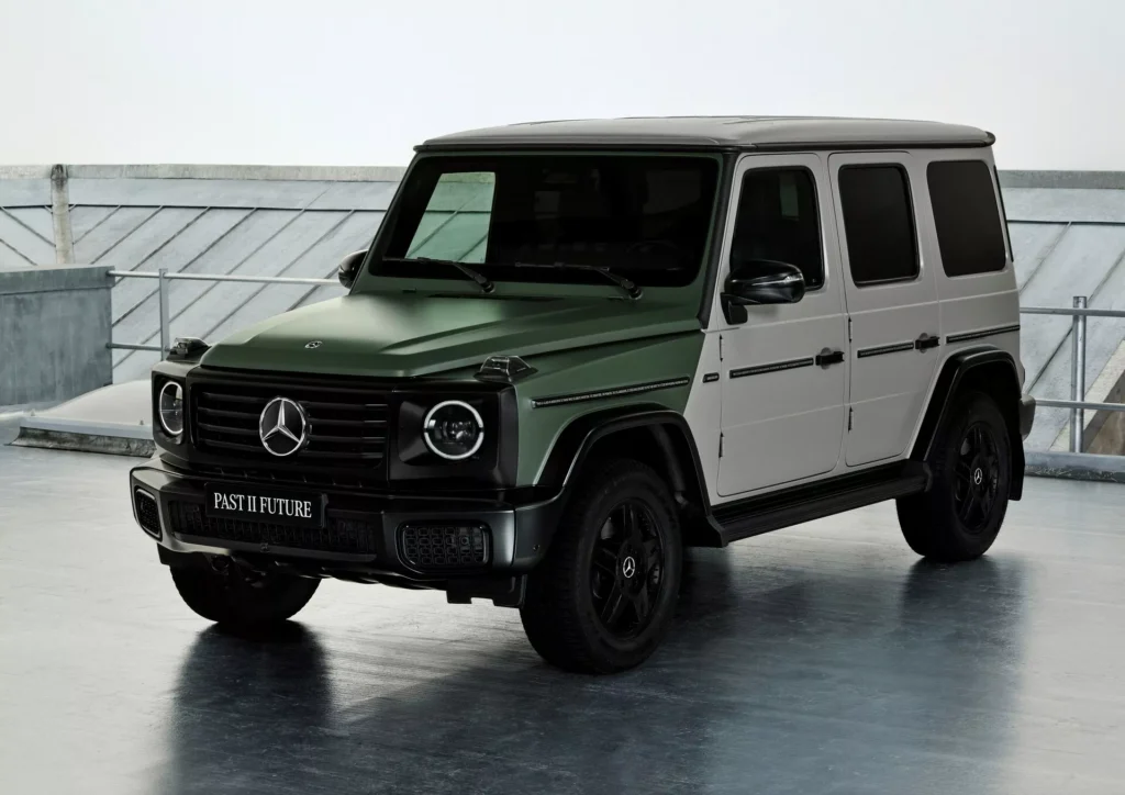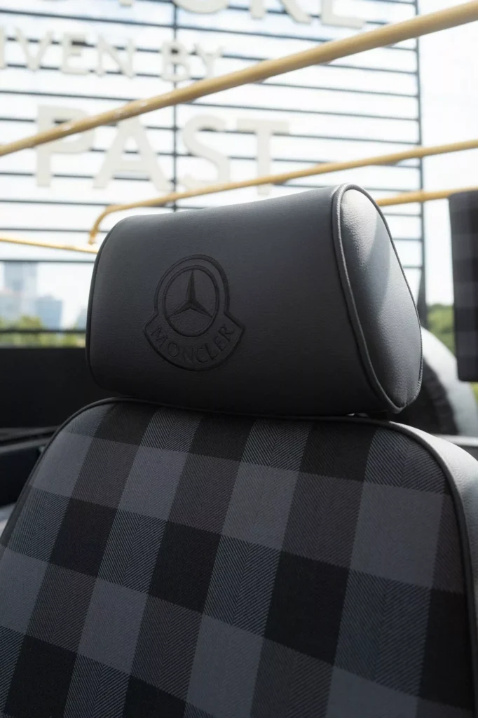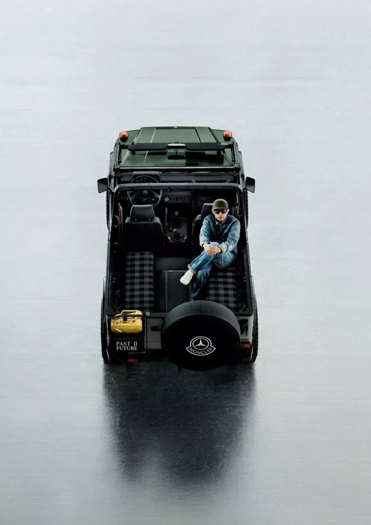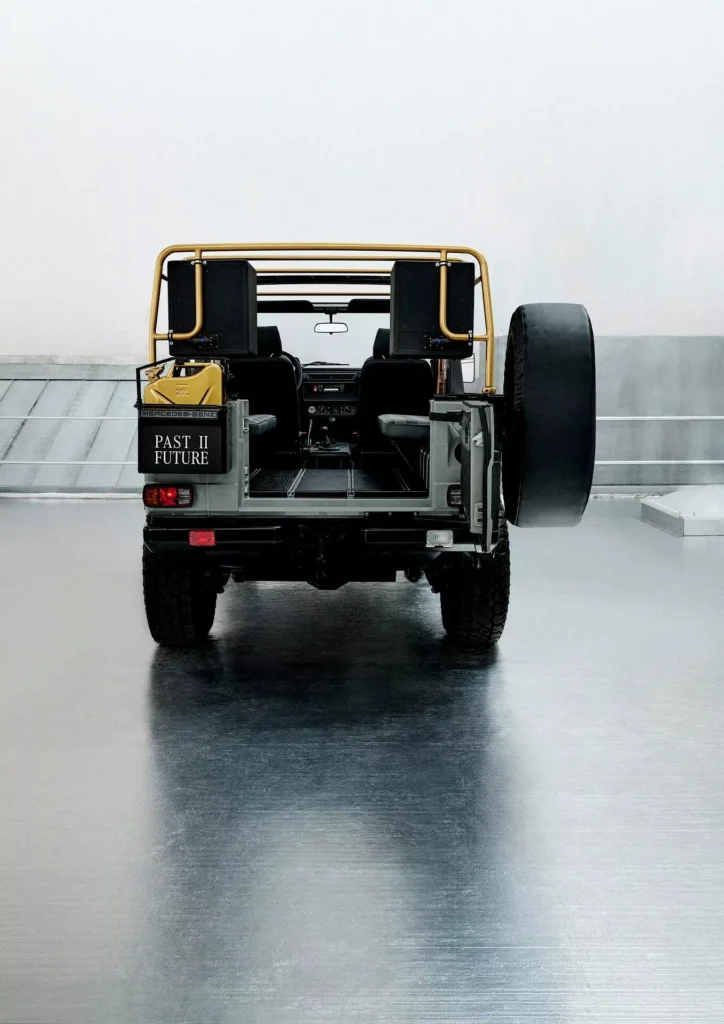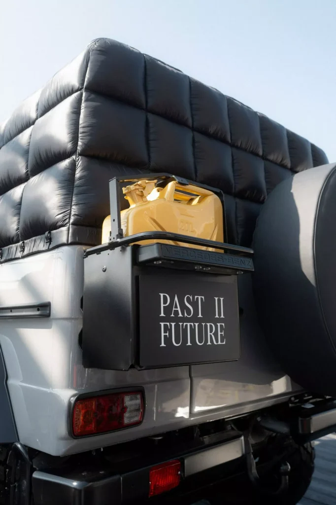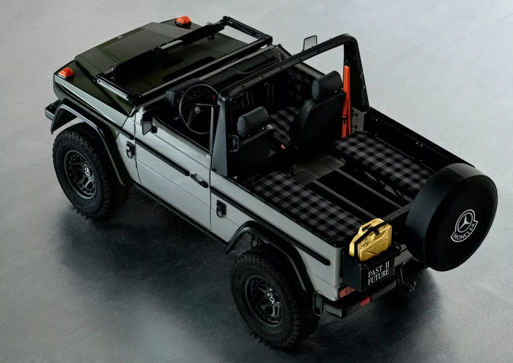 لنبدأ بالنسخة الفنية التي أطلقت عليها مرسيدس اسم جي كلاس Past II Future، وهي مبنية على نسخة جي كلاس كشف من عام 1990، وتعاونت مرسيدس مع شركة الأزياء الإيطالية Moncler لتصميمها، والنتيجة هي خارجية داكنة من لونين، الرمادي والأخضر الزيتوني، مع لمسات سوداء وذهبية متعددة، وسقف قماشي مستوحى من المعاطف المبطنة، مع عجلات فولاذية سوداء، ومقاعد قماشية كلاسيكية.