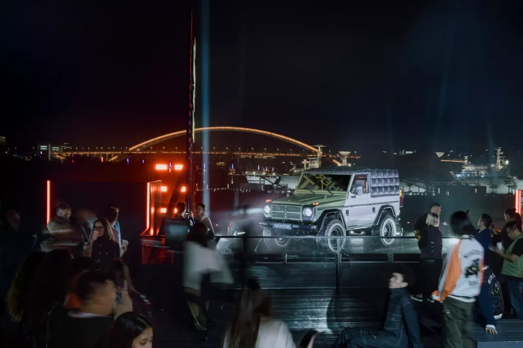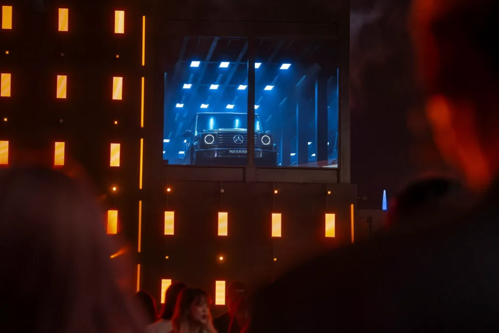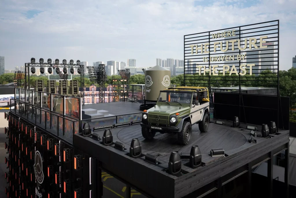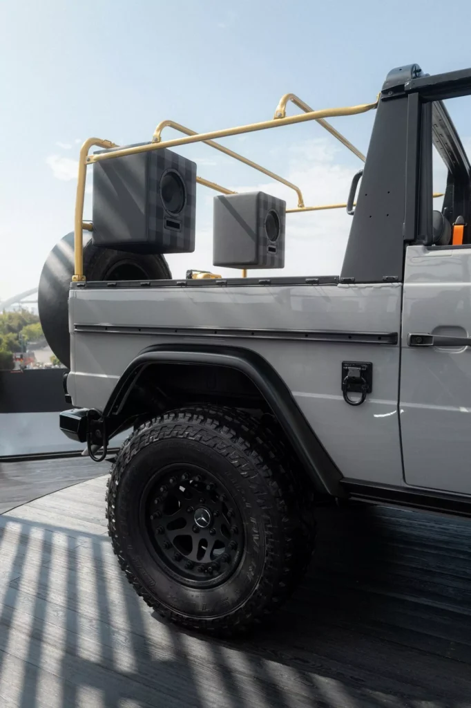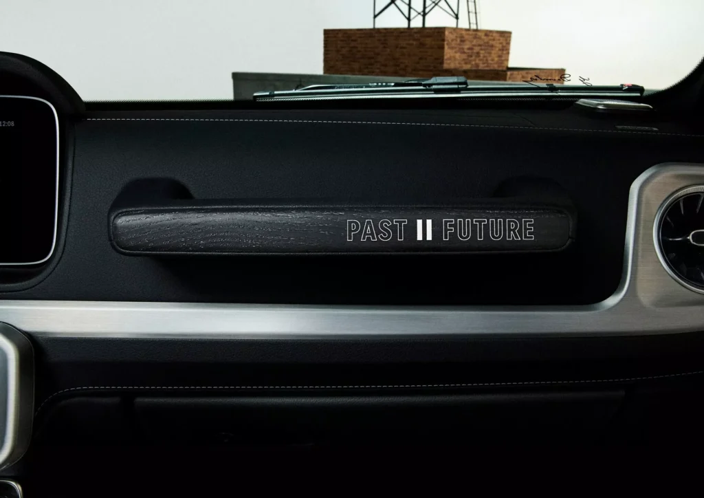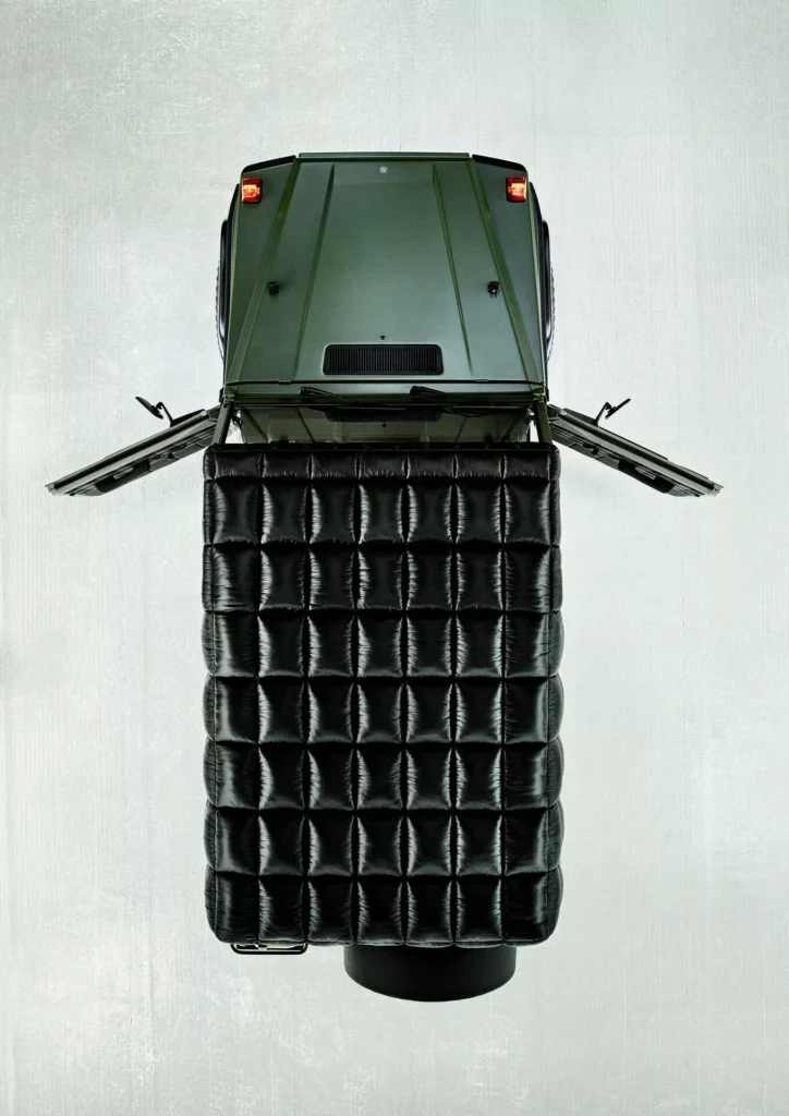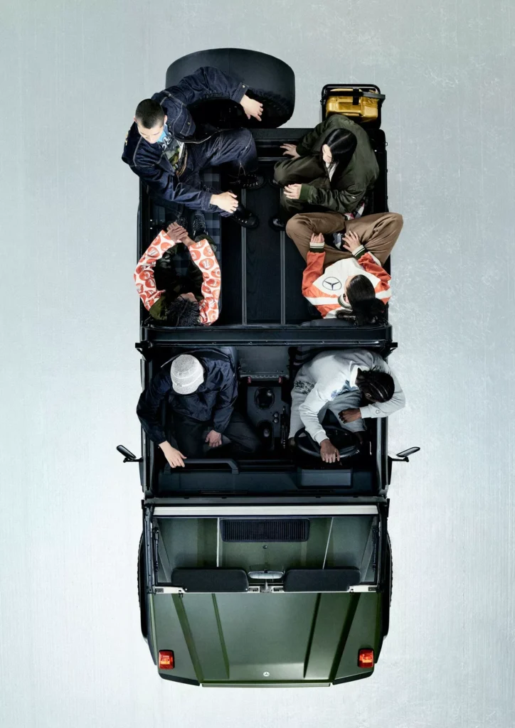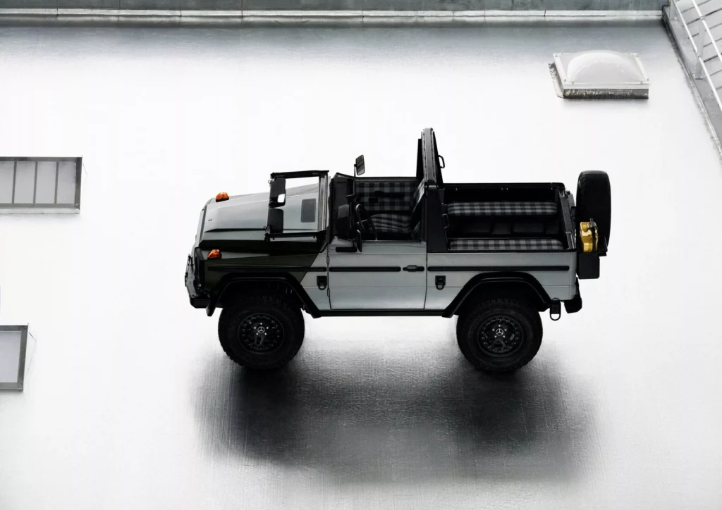لنبدأ بالنسخة الفنية التي أطلقت عليها مرسيدس اسم جي كلاس Past II Future، وهي مبنية على نسخة جي كلاس كشف من عام 1990، وتعاونت مرسيدس مع شركة الأزياء الإيطالية Moncler لتصميمها، والنتيجة هي خارجية داكنة من لونين، الرمادي والأخضر الزيتوني، مع لمسات سوداء وذهبية متعددة، وسقف قماشي مستوحى من المعاطف المبطنة، مع عجلات فولاذية سوداء، ومقاعد قماشية كلاسيكية.