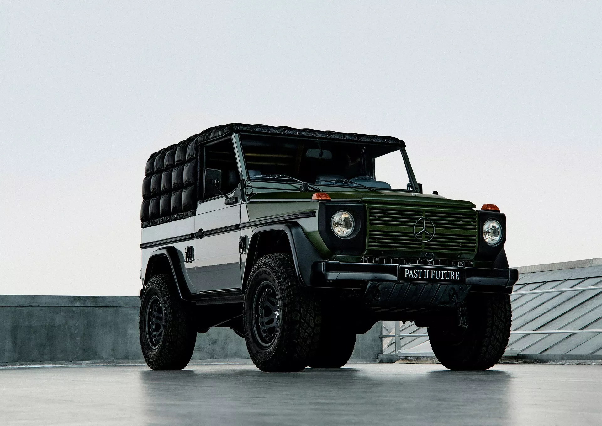 لنبدأ بالنسخة الفنية التي أطلقت عليها مرسيدس اسم جي كلاس Past II Future، وهي مبنية على نسخة جي كلاس كشف من عام 1990، وتعاونت مرسيدس مع شركة الأزياء الإيطالية Moncler لتصميمها، والنتيجة هي خارجية داكنة من لونين، الرمادي والأخضر الزيتوني، مع لمسات سوداء وذهبية متعددة، وسقف قماشي مستوحى من المعاطف المبطنة، مع عجلات فولاذية سوداء، ومقاعد قماشية كلاسيكية.