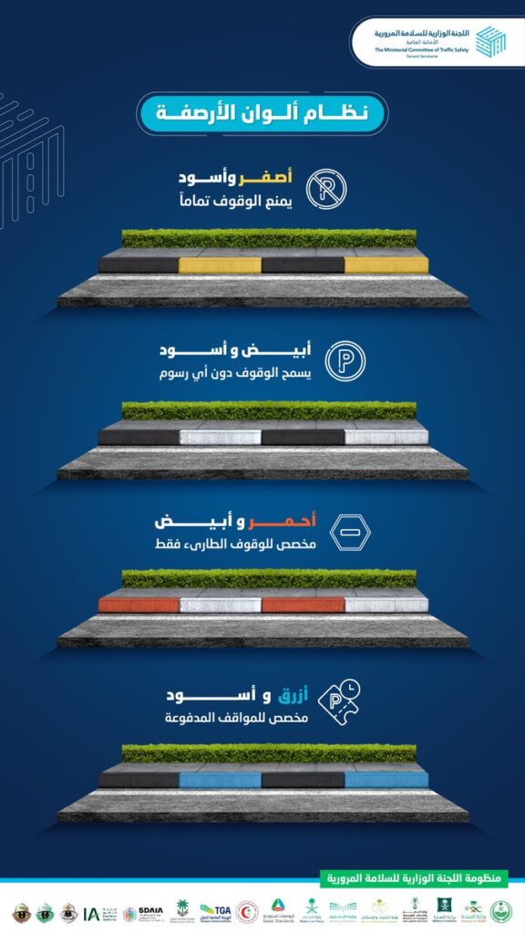 وأوضحت “سلامتك” من خلال إنفوجرافيك نشرته عبر حسابها على منصة إكس، مدلولات ألوان أرصفة الطرق وفقاً لكود الطرق السعودي، ويعني اللون “أصفر وأسود” منع الوقوف تمامًا، واللون “الأبيض والأسود” يعني السماح بالوقوف دون أيّ رسوم.