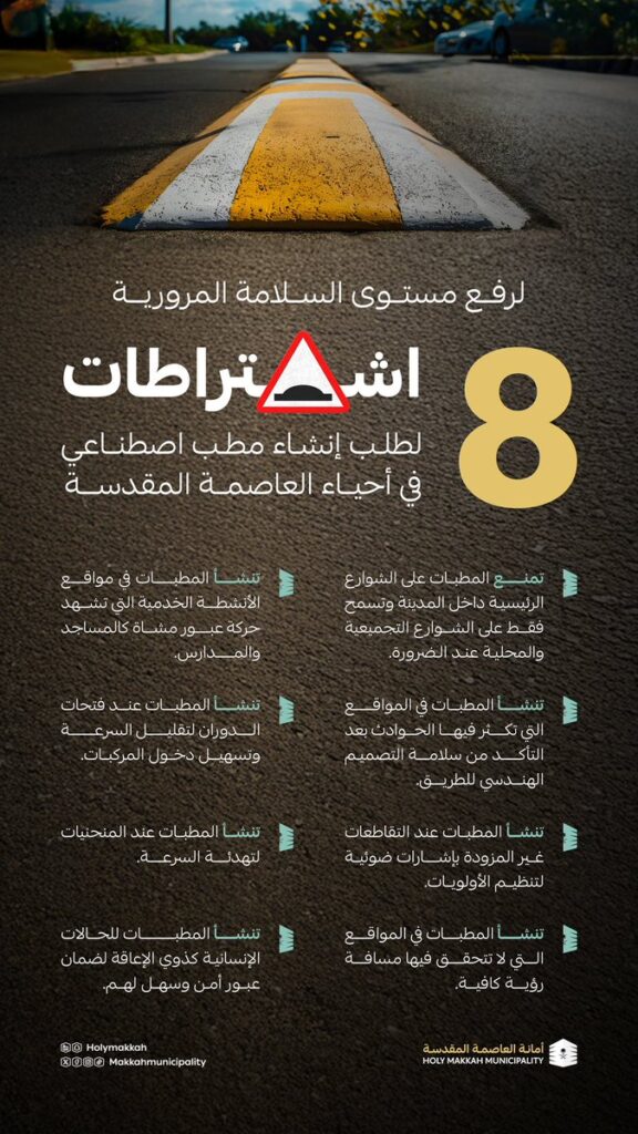 ارابيان درايف – السائق العربي – أعلنت أمانة العاصمة المقدسة، عن وضع 8 اشتراطات أساسية لطلب إنشاء المطبات الاصطناعية في أحياء المدينة، بهدف تحسين تجربة التنقل وتعزيز السلامة المرورية وتقليل الحوادث، خاصة في المناطق ذات الكثافة السكانية العالية.