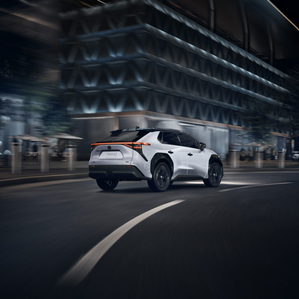 وتتميز النسخة الجديدة Nightshade من bZ4X بتصميم عصري وجريء، حيث تتوفر بألوان ثنائية مثل Wind Chill Pearl أو Heavy Metal مع سقف أسود، بالإضافة إلى خيار اللون الأسود الكامل. كما تأتي مع عجلات معدنية متعددة الأضلاع مقاس 20 بوصة باللون الأسود.