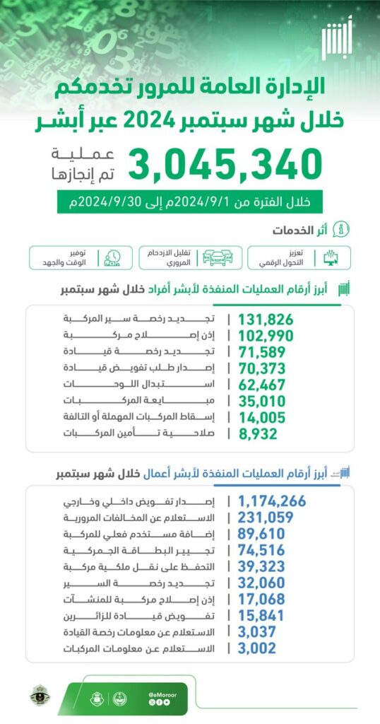 ارابيان درايف – السائق العربي – أعلنت الإدارة العامة للمرور السعودي، عن تنفيذ (3,045,340) عملية إلكترونية خلال شهر سبتمبر عبر منصة “أبشر”، لخدمة المواطنين والمقيمين والزوار، لافتًة إلى أن هذه الخدمات تم تنفيذها خلال الفترة من 1 سبتمبر حتى 30 سبتمبر 2024.