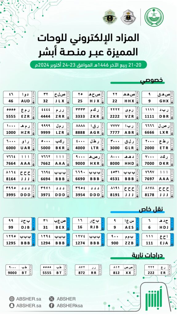 ونشرت “منصة أبشر” إنفوجرافيك عبر حسابها على منصة (إكس)، يكشف اللوحات المميزة المطروحة في المزاد الإلكتروني، وتضمنت لوحات خصوصي، ولوحات نقل خاص، ودراجات نارية.