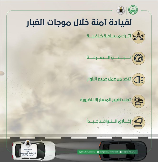 ولتفادي وقوع الحوادث المرورية، وجهت القوات الخاصة لأمن الطرق السعودي، عبر حسابها الرسمي على منصة إكس، 5 نصائح هامة للقيادة بشكل آمن أثناء حدوث موجات الغبار والعواصف الرملية على الطرق، وفيما يلي نستعرضها لكم.