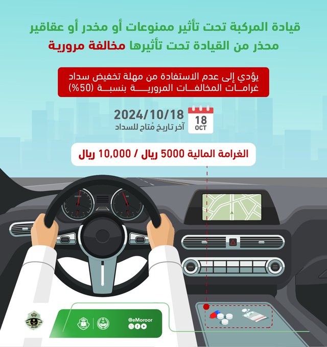 وأكدت إدارة المرور في منشور لها عبر حسابها على منصة إكس، قائلة: “قيادة المركبة تحت تأثير ممنوعات أو مخدر أو عقاقير محذر من القيادة تحت تأثيرها” يؤدي إلى عدم الاستفادة من مهلة سداد غرامات تخفيض المخالفات المرورية بنسبة (50%).