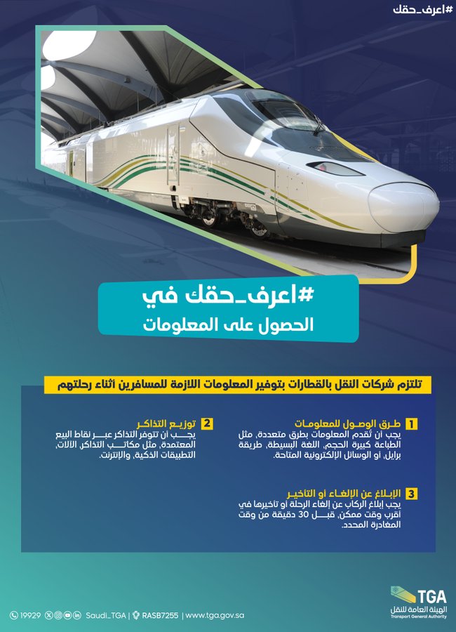 ارابيان درايف – السائق العربي – حثت الهيئة العامة للنقل، شركات النقل في القطارات ضرورة توضيح المعلومات اللازمة للمسافرين أثناء رحلتهم في القطارات.