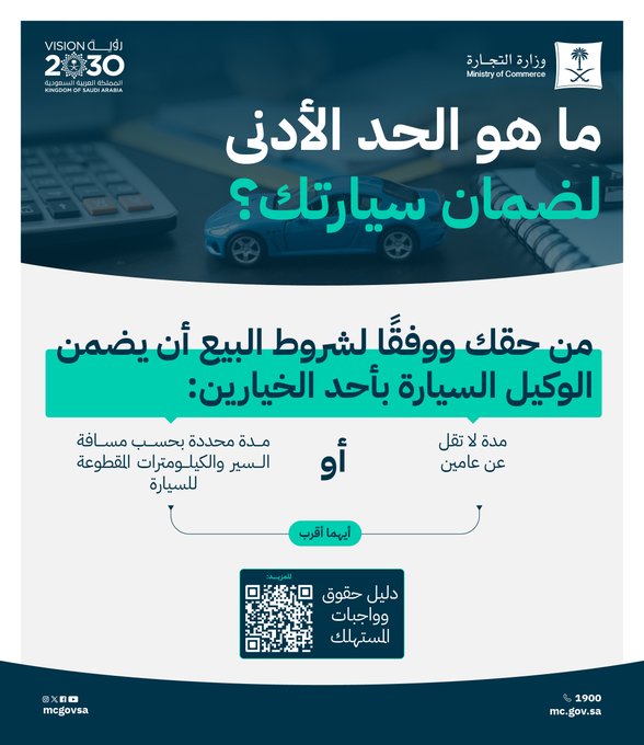 ووضحت الوزارة من خلال إنفوجرافيك نشرته عبر منصة (إكس)، أن من حق المستهلك ووفقاً لشروط البيع أن يضمن الوكيل السيارة بأحد الخيارين، نستعرضها لكم فيما يلي.